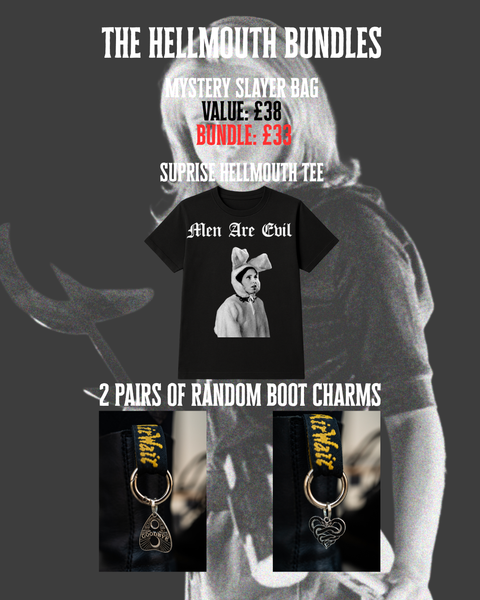 Feeling brave? This bundle is a mystery pick for true Hellmouth fans. You’ll get a surprise Hellmouth t-shirt and two pairs of randomly chosen boot charms.